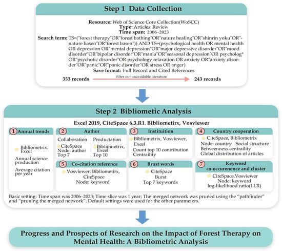 In this research paper, our objective is to elucidate the correlation between the impact of forest therapy and mental health-related publications spanning the past eighteen years. Additionally, we try to conduct a comprehensive analysis of the present status and trajectory of this field of study. First, we imported the data into Bibliometrix software to analyze the annual trends of the number of articles and citations from 2006 to 2023 and used Excel 2019 for data analysis of the tables. Then, we utilized VOSviewer and Citespace software to analyze the collaboration networks of authors, institutions, countries, and co-citations. Finally, we employed CiteSpace and Bibliometrix to conduct keyword co-occurrence clustering, thematic evolution analysis, and burst term analysis to identify research hotspots and trends in the field of the impact of forest therapy on mental health. The specific process is illustrated in Figure 1.