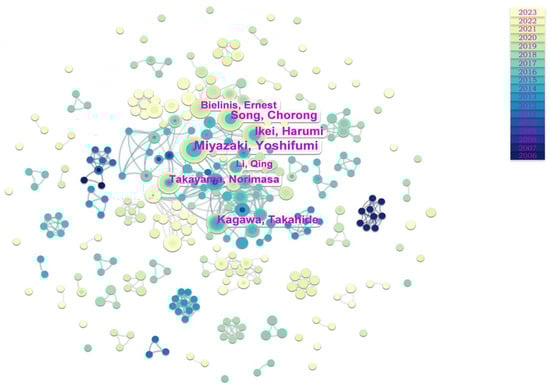 Table 1 reveals that Y. Miyazaki stands out as the leading author, with a publication count of 27 and an impressive total citation count of 2315, accompanied by an h-index of 20. The h-index is a composite quantitative indicator used to assess both the quantity and quality of a researcher’s academic output. It is defined as the following: If a person has N papers that have been cited at least N times each in their entire body of academic publications, then their h-index is N. Furthermore, Y. Miyazaki’s earliest research findings date back to 2006. T. Kagawa emerges with the highest average citations per article, with 18 publications garnering a total of 2465 citations. The h-index of the participating authors varied from 6 to 20.