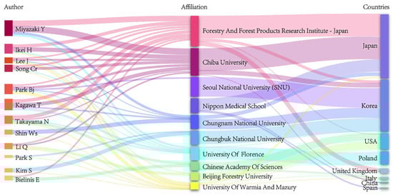 The top 10 institutions with the most publications on the impact of forest therapy on mental health from 2006 to 2023 were identified (Figure 4). Institutions from Japan and South Korea accounted for 17.70% of the total number of papers. The Forestry and Forest Products Research Institute in Japan emerged as the most active research institution in this field, with 34 papers, accounting for 10.29% of the total. Other institutions with significant publication output include Chiba University (26 papers, 7.41%), Nippon Medical School (12 papers, 4.94%), Chungnam National University (11 papers, 4.53%), and Chungbuk National University (11 papers, 4.53%). All three leading institutions originate in Japan and exhibit notable total citation counts and centrality, underscoring Japan’s robust focus on studying the impact of forest therapy on mental health and the substantial academic impact of their publications.