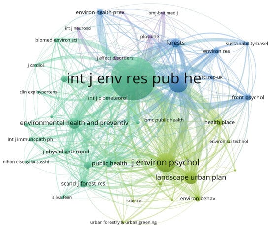 Figure 8 illustrates the co-citation network. We established a minimum citation threshold of 45, and 37 out of 3722 sources surpassed this limit. In the visualization, each node symbolizes a journal, with its size indicating the number of citations the journal has garnered. Lines represent co-citation links between journals, and their thickness denotes the intensity of co-citation between the connected journals. Furthermore, the color of each node is based on the cluster to which it belongs. Journals addressing the effects of forest therapy on mental health were divided into four groups according to their citation frequency. These groups are represented by the colors cyan, grass green, blue, and purple, corresponding to the following journals: International Journal of Environmental Research and Public Health (ISSN: 1660-4601), Journal of Environmental Psychology (ISSN: 0272-4944), Urban Forestry & Urban Greening (ISSN: 1618-8667), and PLOS ONE (ISSN: 1932-6203).