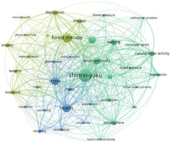 Keywords in a paper can reflect its essential content. By utilizing a co-occurrence network graph of keywords, one can explore the frequency and relationships among them, thereby revealing the research hotspots and emerging trends in a particular field. Figure 9 illustrates the results of keyword co-occurrence analysis. Among 1079 keywords, with a minimum occurrence threshold set at 15, 38 keywords met this criterion. The size and links of nodes represent the frequency of keyword occurrences and the strength of their connections, respectively, and thicker lines indicate stronger keyword associations. Keywords can generally be classified into three types: those related to forest environments, such as “shinrin-yoku” (120), “environment” (60), “atmosphere” (40), and “landscape” (29). Shinrin-yoku, also known as ”forest bathing”, is a Japanese practice that involves immersing oneself in a forest environment to promote physical and mental well-being. The second type concerns psychological states, such as “stress” (67) and “depression” (42). The final type pertains to approaches, such as “health” (71), “natural-killer activity” (42), and “blood pressure” (21). As part of the innate immune system, natural-killer cells (NK cells) can directly recognize and kill abnormal cells. Emotional state has a significant impact on the activity of NK cells; people who have suffered from depression for a long time show a reduction in NK cell activity by more than 20%, which significantly decreases their ability to resist tumor cells [32,33].