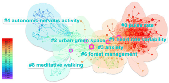 As depicted in the figure, the largest cluster is “pulse rate”, followed by “heart rate variability”, attributed to our extensive research on mood through the assessment of participants’ stress levels. These stress levels were evaluated by using two physiological methods, i.e., measuring heart rate and skin conductance levels [35], as well as one psychological method, i.e., employing the Profile of Mood States (POMS) questionnaire [36]. The third largest cluster, Cluster #2, is “urban green space”. As urban life is getting more closely associated with modern humans, urban green spaces have become a significant focus of forest therapy research [37,38,39]. Although similar trends in mental health benefits are observed in forest environments, differences compared with urban environments exist [17]. Research indicates that there are no significant differences in the values of tension–anxiety, depression–dejection, and anger–hostility [13,40].