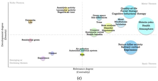 Thematic analysis is a flexible qualitative method used to explore patterns across data, revealing common themes and aiding the understanding of interconnected aspects of a phenomenon [41]. This method allows us to elucidate the thematic evolution of research in this field over time, as depicted in Figure 11. We delineated the period since the emergence of research on the impact of forest therapy on mental health into three distinct sub-periods based on publication counts and growth rates: (a) 2006–2012, (b) 2013–2018, and (c) 2019–2023. The diagram divides research into four quadrants based on centrality and density, providing a clear visualization of research hotspots. Centrality measures how interconnected a specific topic is with other clusters, while density assesses the cohesion within a cluster, indicating the degree of relatedness among keywords. Each circle on the diagram represents a topic, identified by its most frequently used keyword with the circle’s size corresponding to the frequency of that keyword.