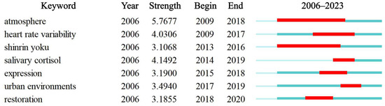 Burst terms serve as valuable indicators for anticipating abrupt shifts and emerging trends within a particular field. By analyzing these emerging terms, citation burst detection reveals the dynamic evolution of publications in the field within a specific timeframe, offering insights into the appeal of the information explosion to scholars. Essential metrics such as burst duration, intensity, and timing serve as crucial benchmarks, capturing the essence of this phenomenon. A sudden surge in citations for particular keywords or articles can uncover novel discoveries and directions. This section explores the citation burst detection of keywords and references relevant to research on the effects of forest therapy on mental health. Figure 12 presents the top seven most cited keywords and references, providing insights into the recurring themes and influential works within this domain.