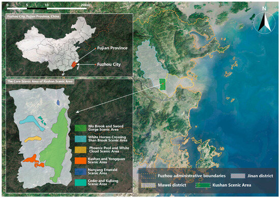 - Kushan Mountain Scenic Area General Planning (2022–2035). Available online: https://gl.fuzhou.gov.cn/zz/zjgl/glgh/202206/t20220616_4380771.htm (accessed on 15 March 2024).
