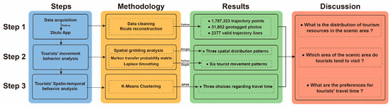 GPS trajectory data are frequently influenced by various factors, leading to deviations and incompleteness in user trajectories. We excluded four types of problematic GPS trajectories and trajectory points: (1) trajectories situated outside the study area; (2) repeated trajectories from the same user; (3) trajectories deviating from the intended scenic routes; and (4) trajectories not adhering to movement rules. To ensure accuracy in screening problematic trajectories and trajectory points, we implemented the following steps: (a) Given the relatively gentle travel route of Kushan Mountain Area, we utilized the findings from Liu et al. [27], which stated that the walking speed is 5 km/h, equivalent to 1.4 m/s. (b) We employed the transformed projected coordinates to calculate the time and distance between two points using the formula presented in Equation (1) [28]. In the formula, represents the previous trajectory point of the user during movement, and represents the subsequent trajectory point. The formula used the absolute value of the difference between two adjacent points, and the distance between two points was calculated. (c) The user’s movement distance was determined by subtracting the arrival time at the previous point from the arrival time at the next point. (d) To assess the variance between the user’s theoretical and actual distance, we multiplied the resulting time by the speed (1.4 m/s). We removed the trajectory point if the actual distance exceeded the theoretical distance. This method allowed us to evaluate whether the user’s movement data adhered to the movement rules. Following data cleaning, we identified 2377 valid trajectory lines, 1,787,323 trajectory points, and 31,802 user-uploaded photos. Moreover, we used the point of interest (POI) acquisition tool from Guihuayun (http://guihuayun.com/poi/, accessed on 31 October 2023) to collect POI data for the primary attractions in the scenic area, obtaining POI information for 37 attractions. After finishing the data cleaning process, we will adhere to the procedures outlined in Figure 2.