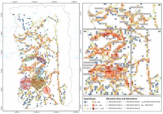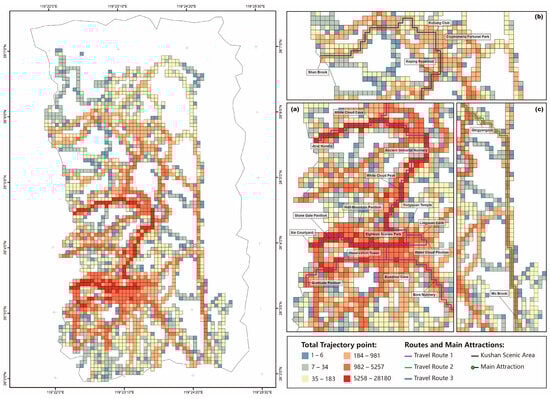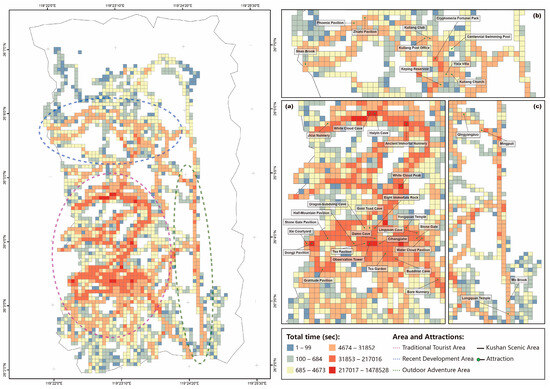 The various colored grids depicted in Figure 3. illustrate the total length of tourists’ stays in different areas of the Kushan Scenic Area. This visualization offers valuable insights into tourists’ preferences and areas of interest. Specifically, Figure 3. highlights three distinct areas within the Kushan Scenic Area that attract tourists. They are designated as the Traditional Tourist Area, the Recent Development Area, and the Outdoor Adventure Area, as shown in Figure 3a–c, respectively.