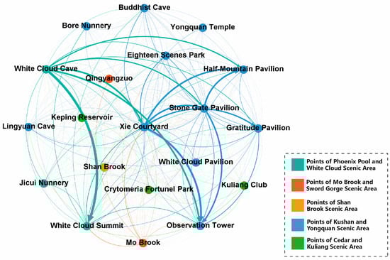 Meanwhile, we charted the in-degree and out-degree tourist flow among attractions based on the transfer frequency statistics in Table 4, depicted in Figure 6. There is a greater mutual transfer of tourists between attractions in the Kushan and Yongquan Scenic Area and the Phoenix Pool and White Cloud Scenic Area. The results indirectly indicate that attractions in the Kushan and Yongquan Scenic Area and the Phoenix Pool and White Cloud Scenic Area exhibit higher competitiveness and are more recognized by tourists regarding tourism appeal.