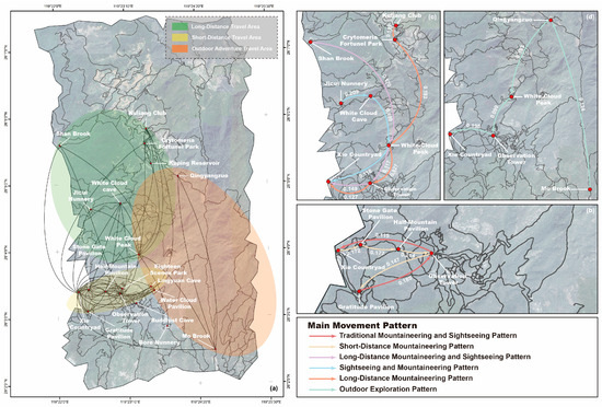 Analysis of tourist movement patterns between different attractions. (a) The overall movement of tourists between attractions in the Kushan Scenic Area. (b) Tourists showed two movement patterns in the Traditional Tourist Area. (c) Tourists showed three movement patterns between the Recent Development Area and the Traditional Tourist Area. (d) Tourists showed one movement pattern between the Outdoor Adventure Area, the Recent Development Area, and the Traditional Tourist Area.
