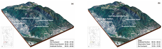 - Short-Distance Mountaineering Pattern: 50% of the tourists chosen to depart from the Gratitude Pavilion at 09:32 a.m., arrive at the Observation Tower at 11:10 a.m., and leave from the Xie Courtyard at 12:26 p.m., as shown in Figure 8b.
