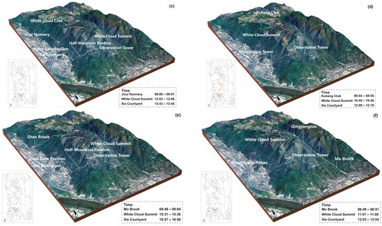 - Outdoor Exploration Pattern: 90% of the tourists chosen to depart from Mo Brook at 06:49 a.m., arrive at the White Cloud Summit at 11:07 a.m., and leave from the Xie Courtyard at 12:03 p.m., as shown in Figure 8f.