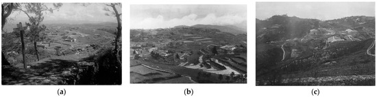 Old photos of Kuliang Resort Area. (a) Overlooking Kuliang from the intersection of Jacob’s Ladder and West Road. (b) Resort villas in Kuliang Resort Area. (c) An aerial view of the Guling Resort Area [36,37].