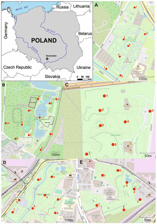 Location of the area studied against the background of Poland and Sosnowiec city: (A)—Park Kruczkowski, (B)—Park Leśny (Kuronia), (C)—Park Schöena, (D)—Park Sielecki, (E)—Park Dietla and 1–11—location of sampling points.