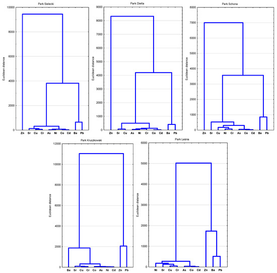 For PK and PL, intersecting the clusters at the 3000 level show two main groups of elements. In the first of these, we can include PK Ba, Sr, Cu, Cr, Co, As, Ni and Cd, while we can include Zn and Pb in the second. In Park Leśna, the first group includes Ni, Sr, Cu, Cr, As, Co and Cd and the second group includes Zn, Ba and Pb.