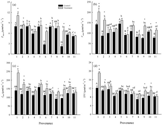 Comparisons of (a) Pmax-a, (b) Vcmax, (c) Jmax, and (d) TPU between treatments and among provenances (mean ± SE). Different capital letters indicate significant differences among provenances in the control (p < 0.05), and different lowercase letters indicate significant differences among provenances in the warming treatment (p < 0.05). * indicates a significant difference in that provenance between the control and warming treatment (p < 0.05). Refer to Table 2 for provenance codes and Table 3 for abbreviations of photosynthetic characteristics.