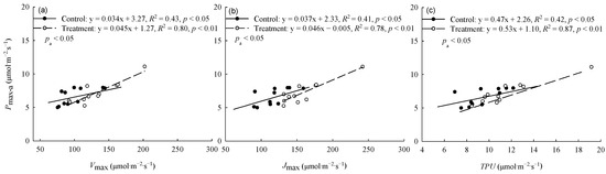 Relationships between Pmax-a and (a) Vcmax, (b) Jmax, and (c) TPU. Pa represents the significance of the difference in slope between regression equations. Refer to Table 3 for abbreviations of photosynthetic characteristics.