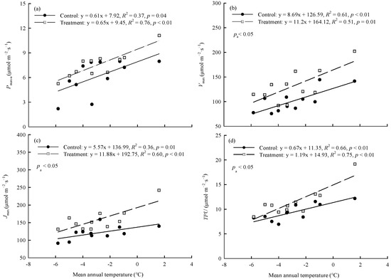 Relationships between (a) Pmax-a, (b) Vcmax, (c) Jmax, (d) TPU and the mean annual temperature of original sites. Refer to Table 3 for abbreviations of photosynthetic characteristics.