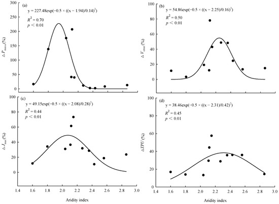 Relationships between effect of warming on (a) maximum net photosynthetic rate (ΔPmax-a), (b) maximum carboxylation rate (ΔVcmax), (c) maximum electron transport rate (ΔJmax), (d) triose phosphate utilization rate (ΔTPU), and aridity index of the original sites. Aridity index = mean annual evaporation/mean annual precipitation.