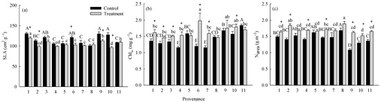 Comparisons of (a) SLA, (b) Chlm, and (c) Narea between treatments and among provenances (mean ± SE). Different capital letters indicate significant differences among provenances in the control (p < 0.05); different lowercase letters indicate significant differences among provenances in the warming treatment (p < 0.05); * indicates a significant difference between the treatment and control in that provenance (p < 0.05). Refer to Table 2 for provenance codes; refer to Table 3 for abbreviations of photosynthetic characteristics.