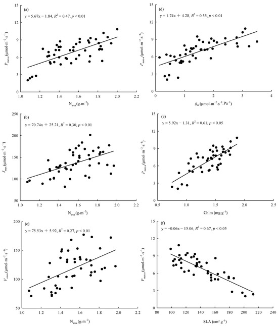 Relationships between Narea and (a) Pmax-a, (b) Jmax, and (c) Vcmax, and between Pmax-a and (d) gm, (e) Chlm, and (f) SLA. Refer to Table 3 for abbreviations of photosynthetic characteristics.