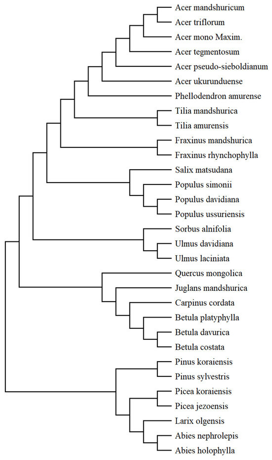 The procedure for generating the phylogenetic tree for the 31 tree species in this study began with obtaining protein molecular sequences for the species from the National Center for Biotechnology Information (www.ncbi.nlm.nih.gov, accessed on 12 December 2023). Due to the limitation of protein molecular sequence data for different organs of these 31 tree species, the chosen organ was the mature enzyme K (maturase K [chloroplast]) in tree leaves. Then, the Molecular Evolutionary Genetics Analysis software (MEGA_X_10.2.4) was used to perform phylogenetic analysis on the protein molecular sequence information of these tree species and generate usable phylogenetic tree files in NWK format. The finalized phylogenetic tree for these 31 tree species is shown in Figure 2.