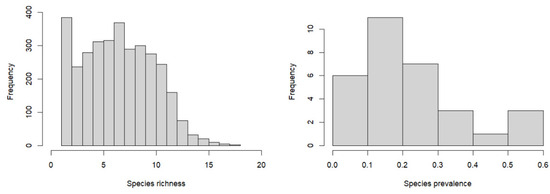 Tree species distribution frequency of the community data (for species richness (left), the y-axis (frequency) corresponds to the number of sampling plots, and the x-axis to the number of species in each sampling plot; for species prevalence (right), the y-axis (frequency) corresponds to the number of species, and the x-axis to the fraction of sampling plots in which the species is present).