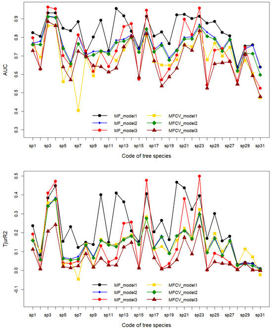 Combining the model forms—model FULL (model 1), model ENV (model 2), and model SPACE (model 3)—with the type of model prediction, i.e., interpretability (MF) and predictive power (MFCV), six combination schemes are formed. The evaluation of these 31 tree species using AUC and Tjur R2 metrics is displayed in Figure 4. The results reflected by the AUC and Tjur R2 metrics for the distribution of the 31 tree species are consistent across all models, indicating that, within the same model, interpretability exceeds predictive power. This outcome is expected since interpretability uncovers all the information within the data. The interpretability and predictive power of the 31 tree species in model ENV are almost identical, resembling the predictive power of model FULL, suggesting that model ENV has stable extrapolation capabilities.