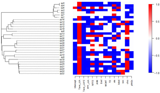 Heatmap of estimated parameters β of model FULL, i.e., species niches. Red and blue colors show parameters that are estimated to be positive and negative, respectively (with at least 0.95 posterior probability in Model FULL).