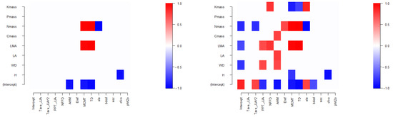 Heatmap of estimated parameters γ linking species traits to species niches of model FULL. Red and blue colors show parameters that are estimated to be positive and negative, respectively (with at least 0.95 posterior probability in the left, and 0.85 in the right).