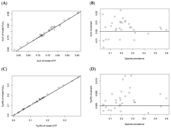 The HMSC model uses tree species trait data to estimate parameters reflecting the response of tree species traits on their niches and uses tree species phylogenetic information to estimate parameters indicating the strength of the phylogenetic signal in tree species niches. These two parameters integrate tree-level information into community-level parameters, hence incorporating tree species traits and phylogeny into the model helps to synthesize information extracted from community data. However, whether the introduction of tree species traits and phylogeny can enhance the predictive ability of the HMSC model still needs to be assessed [16]. To this end, a new model, NTP, which does not include information on tree species traits and phylogeny, was set up on the basis of model FULL and applied to the same data. The predictive evaluation metrics AUC and Tjur R2 of both models were then compared in cross-validation (Figure 7).
