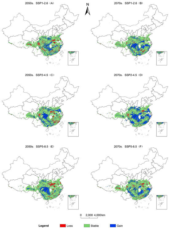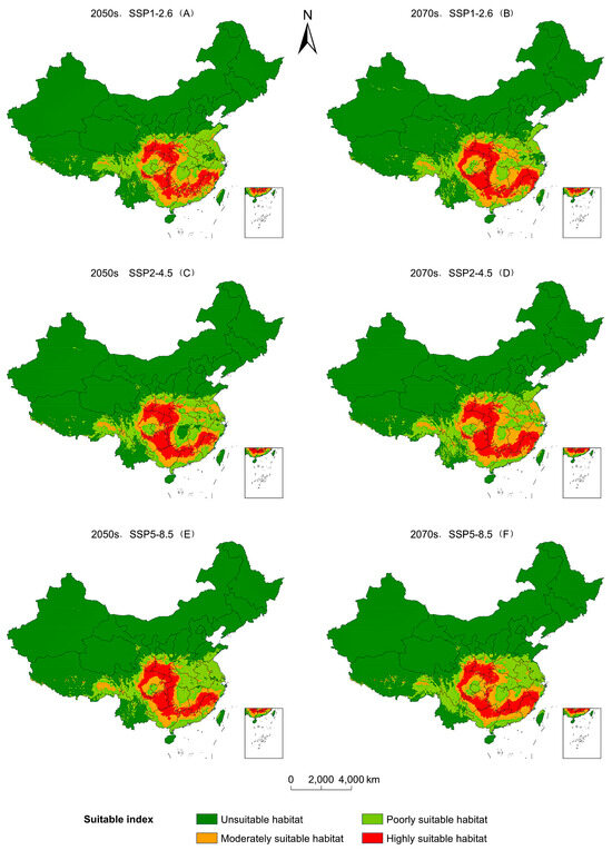 - The predicted suitable habitat for Q. oxyphylla is primarily in southern China, characterized by a subtropical monsoon climate, with Sichuan province displaying the largest area of suitability. Additionally, a well-defined suitable range is identified within the plateau climates of Yunnan and Tibet, indicating that Q. oxyphylla can thrive in high-altitude regions with unique climatic conditions. The overall geographical boundaries of Q. oxyphylla are predicted to remain similar to the current ones, with a southwestward migration and expansion.
