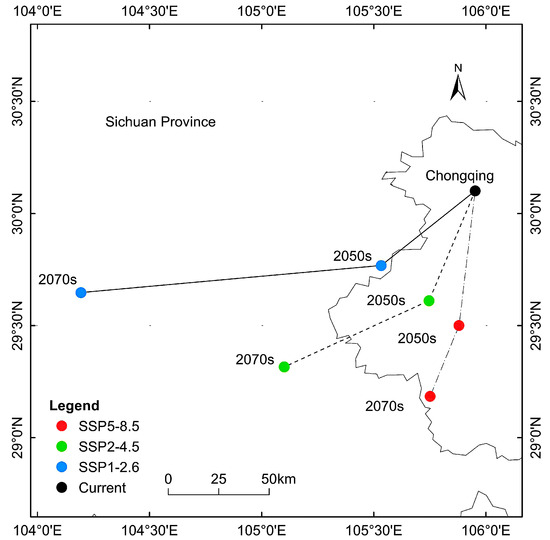 3.5. Shift of the Geometric Center across Various Climate Scenarios