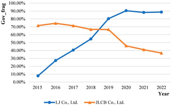 Figure 3 reveals the annual average level of governance fragmentation in forestry communities previously managed by SOFEs of these two forest industry groups. Theoretically, the level of governance fragmentation should follow an inverted U-shaped curve with its opening facing downwards throughout the entire reform period. The inverted U-shaped curve indicates the transition of governance functions and responsibilities from SOFEs to local governments and an ideal state where governments, not SOFEs, bear all the relevant community governance responsibilities and work after the complete and final separation of government and social functions from SOFEs. During this process, the level of governance fragmentation shows an initial upward trend followed by a decline. It can be observed that the governance fragmentation level of the communities under LJ Co., Ltd.’s SOFEs shows an upward trend each year, with a noticeable increase after 2018. This indicates that as administrative and social functions are transferred to the government, the actual participants in relevant management and service activities gradually involve both the enterprises and local governments, leading to an increase in the level of fragmentation. In 2020, LJ Co., Ltd. finished the transfer of 2151 administrative powers of forestry community governance from the SOFEs to local governments, and passed the national acceptance that year, marking a turning point reflecting the transfer of governance leadership. There was also a significant decrease in the average governance fragmentation level in 2019 for JLCB Co., Ltd., possibly due to significant progress in the functional transfer work completed in that year before the reform acceptance in 2020. The trend line of JLCB Co., Ltd. in Figure 3 shows a distinctly different pattern compared to the trend line of LJ Co., Ltd. because LJ Co., Ltd. was in the early stage of functional transfer and did not reach the inflection point until 2020, while JLCB Co., Ltd. reached the inflection point since 2016 and entered the later stage of substantive work transfer, with the local governments taking the dominant governance position. This can further explain why, in the later stage of the average monthly interaction, the number of days of interaction between SOFEs and local governments for LJ Co., Ltd. exceed those of JLCB Co., Ltd. in Figure 2.