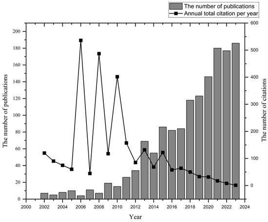The number of publications and times cited per year in 2002–2023.