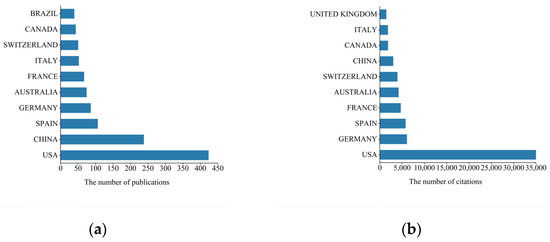 The number of publications (a) and citations (b) in the top 10 countries.
