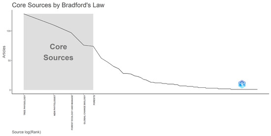 Our analysis encompassed 212 journals that featured research on drought-induced tree mortality mechanisms. The leading journals were evaluated based on publication volume and citation counts (Figure 3). Tree Physiology dominated with 122 articles (Figure 3a), while New Phytologist garnered the highest citation tally, closely trailed by Tree Physiology (Figure 3b). This positions Tree Physiology as the preeminent journal in the field, excelling in both publication and citation metrics. Furthermore, employing Bradford’s law to identify the most influential journals, our dataset pinpointed 223 core journals (Figure 4). The quintet of the most active journals is as follows: Tree Physiology (ISSN: 0829-318X), New Phytologist (ISSN: 0028-646X), Forest Ecology and Management (ISSN: 0378-1127), Global Change Biology (ISSN: 1354-1013), and Forests (ISSN: 1999-4907). These journals have consistently published significant research, shaping the discourse and advancing knowledge in the study of tree physiology under drought conditions.