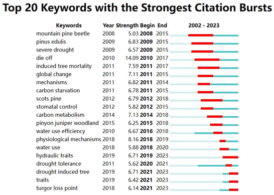 Notably, upon analyzing the top 20 keywords with the strongest citation bursts, we identified two keywords associated with tree species: “Pinus edulis” (Pinus edulis E.) and “Scots pine” (Pinus sylvestris L.). In light of this discovery, we undertook an in-depth examination of the pertinent literature. The surge in the keyword “Pinus edulis” commenced in 2009, predominantly attributed to extensive mortality of this species in western North America, a consequence of drought induced by global climatic shifts [36,37,38,39]. Furthermore, our analysis indicates a significant surge in the keyword “Scots pine” since 2012. Delving deeper, we discovered that over the past decade, widespread drought in Europe has led to substantial Scots pine mortality [40,41,42], garnering considerable attention from the academic sphere. In addition, to achieve a more profound comprehension of the tree species impacted by extreme weather conditions within the retrieved publications, we compiled an exhaustive table, the details of which are presented in the Supplementary Material (Table S1). The susceptibility of these arid-adapted species to drought-induced decline underscores the significant repercussions of water scarcity on tree species survival.