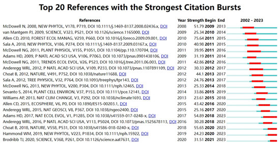 In Figure 6, the most representative references, selected based on burst duration, intensity, and timing from the previous clustering analysis, are highlighted with the beginning of each burst marked in bold. Notably, the articles by Allen CD, Choat B, and Adams HD exhibit the most pronounced burst intensity. Furthermore, the citation burst for McDowell N’s article commenced in 2008, prior to those of the other authors.