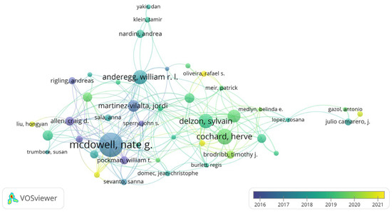 In the visualization, the link thickness and the distance between nodes represent the level of cooperation among authors. By establishing a threshold at 10 for the minimum number of papers an author must publish within the field, out of 5386 authors, 45 were found to be eligible. The majority of the authors maintain regular communication with one another, with the exception of a single author who does not engage in collaborative efforts. The network of collaborations among these authors is notably centralized. Mcdowell NG has the highest number of collaborative relationships among the authors, succeeded by Choat B and Cochard H. There has been a noticeable decline over time in the number of authors participating in cooperative relationships. The majority of these author collaborations are concentrated in the period between 2017 and 2020.
