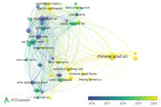The timeline visualizations of the institutions’ co-authorship networks, which were created in the same manner as those of the authors, are displayed in Figure 8. This procedure demonstrated the connections between several institutions. We established a minimum requirement of 20 publications for an institute. Out of the 1547 institutes, 44 were ultimately chosen. There is a clear quantitative difference in the cooperative network. At the heart of the collaborations and the top institution with the greatest number of collaborative ties is the Chinese Academy of Sciences (CAS). Furthermore, it is noteworthy that the CAS continues to have close working relationships with the majority of institutes. Over time, the number of institutions collaborating with the CAS has steadily increased, with the majority being centered in the 2020s.