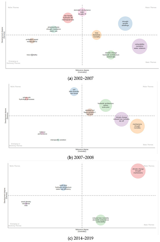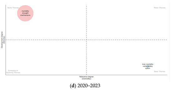 Figure 11 illustrates the evolution of studies on drought-induced tree mortality mechanisms over time by classifying the time since the occurrence of these studies into four sequential sub-phases based on the number of publications: 2002–2007, 2008–2013, 2014–2019, and 2020–2023. The strategy map clearly identifies the study’s crucial research subjects by dividing all topics into four quadrants based on centrality and density. The cohesion within a cluster is reflected by its density, while the interactions between clusters are quantified by their centrality. Motor themes are displayed in the first quadrant (top right), demonstrating how well-developed and significant the subject is already, in addition to its strong specialization. Niche themes are shown in the second quadrant (top left), which suggests that although the topic is well-developed, it has not attracted many scholars and is not significant in the area right now. Emerging or declining topics are represented by the third quadrant (bottom left), which highlights emerging topics with less development. Basic themes are represented by the fourth quadrant (bottom right), which shows that although research on the mechanisms underlying drought-induced tree mortality is essential, it is still in its infancy. The most common keyword is used to identify the theme represented by each circle. The area of the circle grows with frequency, and the size of the circle is determined by how frequently the keyword appears. The themes of “climate-change”, “drought”, and “mortality” have appeared three times in each of the four sub-phases of the study of drought-induced tree mortality mechanisms since they first appeared in the first phase. The area of the circle has always been large, indicating that the themes of “climate-change”, “drought”, and “mortality” have grown in importance.