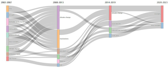 Thematic evolution of tree drought death mechanism-related publications (2002–2023).