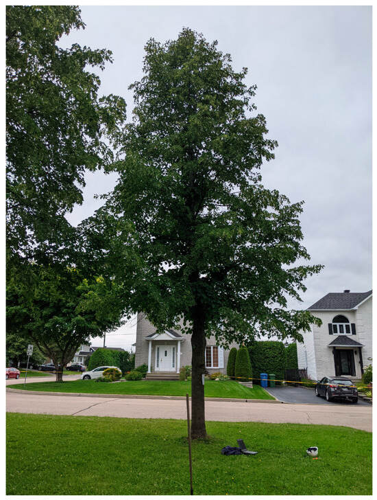 During two consecutive summers to early fall seasons (May to October in the years 2021 and 2022), a total of 28 individuals of 2 of the most abundant tree species from the public inventory of trees of Quebec City [], Quebec, Canada (Acer platanoides L. and Tilia cordata Mill.) were sampled across 6 municipal parks: (1) des Capucins, (2) de l’Apprenti-Sage, (3) des Brumes, (4) Place de Verneuil, (5) Près de Lisieux, and (6) Courcival. The selection of municipal parks was contingent upon the presence of at least three individual trees that met our established criteria. The trees sampled were selected to meet the following criteria: