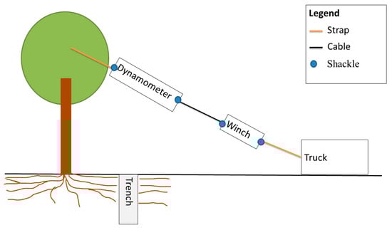 In arboriculture and urban forestry, the static pull tests for single trees are frequently used to appraise the structural attributes of the trunk, as well as to gauge its anchorage to the ground [,]. This is particularly pertinent when construction activities are near roads and other infrastructures []. The methodology followed the principles outlined by Brudi and van Wassenaer (2002), where we used static pull tests to evaluate tree stability based on their structural properties and root anchorage []. The experimental setup consisted of connecting a tree to a mechanical winch and a solid anchoring point using a cable. The tree attachment protocol is illustrated in Figure 2, which began at the tree trunk, where a strap was connected to a dynamometer for force measurement. Subsequently, the dynamometer was linked to a cable, which was connected to a mechanical winch with a capacity of 1600 kN. The winch, in turn, was secured to an anchoring point using another strap. In this study, we used a 3-ton Ford-E250 van as the anchoring point, mainly selected for its sturdiness. To ensure accurate measurements, the selection of the attachment point on the tree was based on trunk diameter and the presence of forks. The chosen tree trunk section must be sufficiently robust to withstand the test without breaking. In order to minimize movement during testing, several chocks were placed beneath the van’s wheels. An elastomer, positioned at 1 m above the ground on the compression side of the trunk, measured wood fiber deformation during the test with a precision of 1 µm. This measurement facilitated the assessment of wood deformation and the determination of its proximity to the elastic deformation limits established for the sampled species (A. platanoides L. and T. cordata Mill.), corresponding to the threshold for permanent tree trunk damage []. The aim here was not to model stem resistance but rather to ensure the safety of the operations and to avoid permanent damage to the stem. To measure the inclination induced by the test accurately, two inclinometers were positioned at the base of the tree trunk. To mitigate potential measurement errors caused by tree trunk bending, the inclinometers were placed as close as possible to the roots, while avoiding being directly placed on them. The precision of these inclinometers was set to 0.0002°. Throughout the testing process, the angle of the cable was continuously monitored using a sensor integrated into the dynamometer. Communication among the elastometer, inclinometers, and dynamometer was established wirelessly with a computer station. Data acquisition was conducted using TreeQinetic MD version 5.0.0.3 software, which is part of the TreeQinetic PiCUS system MD.