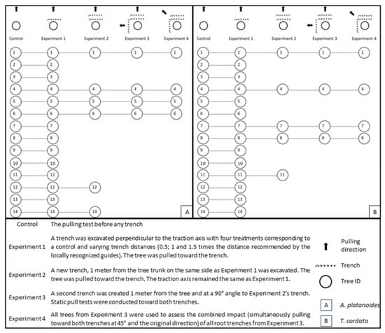 During Experiment 1, a trench was excavated perpendicular to the traction axis with four treatments corresponding to a control and varying trench distances. The treatments are the following: (1) Control: measurement taken before trench excavation, (2) Treatment 1: trench excavated at 1.5 times the distance recommended by the local guides, (3) Treatment 2: trench excavated at the recommended distance by the local guides, and (4) Treatment 3: trench excavated at 0.5 times the recommended distance by the local guides [,]. These treatments were assigned to trees randomly, except when logistical constraints or practical considerations arose as obstacles (e.g., underground pipe detected). For all treatments, the tree was pulled toward the trench (using the method described in Section 2.2). For this study, we considered T. cordata to have a low tolerance to root damage and A. platanoides to be moderately tolerant, leading to multiplication factors of 12× DBH and 15× DBH, respectively, for the recommended protection zones. Distances between each tree and the trench can be found in Table S4.