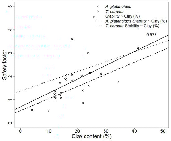 According to the model selection using minimized AICc, the most likely models are models 19 and 20 (Table S6). Both models include species and a variable related to soil texture, clay content (%) for model 20, and sand content (%) for model 19. None of these variables are sufficient to explain the initial safety factor since models with single variables had higher AICc. Figure 5 shows the relationship between the safety factor, species, and clay content (%). The safety factor increases with clay content (%) and A. platanoides tends to show higher values than T. cordata. The correlation between predicted and observed values for model 20 is 0.67.