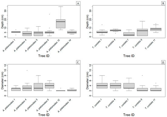 The root systems of both species remained near the surface, with the majority of the roots within 20 cm of the surface at a distance of 1 m from the trunk. The mean rooting depth was approximately 7 cm for A. platanoides and 6 cm for T. cordata (Figure 6). The mean root diameter was also similar between species, with a mean of 3 cm for A. platanoides and 4 cm for T. cordata. The number of roots with a diameter > 2 cm at 1 m from the tree stem was also comparable between species, although the mean number was slightly lower for A. platanoides (12 roots for A. platanoides and 14 for T. cordata), which is likely explained by its smaller size (mean DBH for A. platanoides = 28 cm, mean DBH for T. cordata = 31 cm).