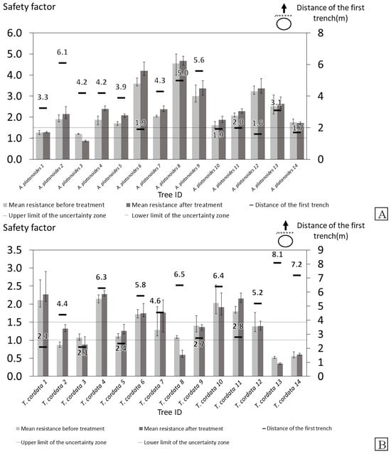 Mean safety factors for uprooting of individual trees before and after trenching at range of distances from stem. Error bars represent maximum and minimum safety values for given tree. Distance between trunk and trench is presented for each tree. (A) A. platanoides. Data from 2 parks in Quebec City. (B) T. cordata. Data from 4 parks in Quebec City.