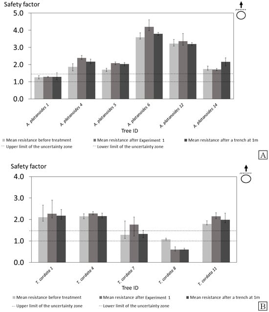 Figure 7 compares the safety factor before and after trenching at various distances linked to existing guidelines [,]. Dotted horizontal lines highlight the lower (safety factor = 1) and the higher limit of the uncertainty zone (safety factor = 1.5). Error bars show maximum and minimum values for a given tree. Initial tree stability was quite variable between trees; many trees had safety factors between 1 and 1.5 but most were above 1.5. Only three trees that initially had a safety factor above 1 dropped below 1 after trenching; these trees were only slightly above this threshold before trenching. The reverse effect was observed for one tree.