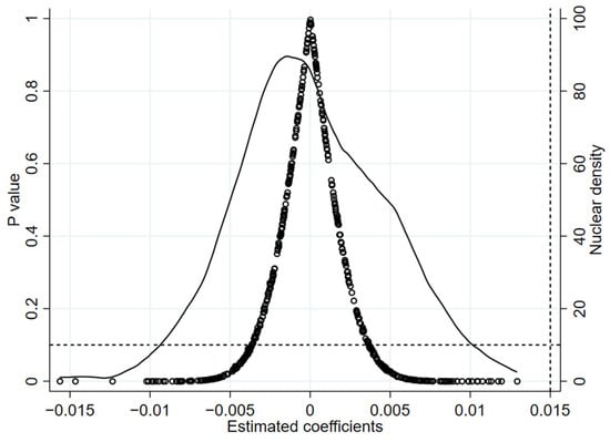 In this paper, the placebo test of baseline regression is conducted using a counterfactual framework. Specifically, this paper adopts the treatment method of a non-parametric replacement test to conduct random sampling of all prefecture-level cities and policy times without repetition. Since there are 163 prefecture-level cities belonging to national forest cities, 163 prefecture-level municipalities where national forest cities are located were randomly selected as the treatment group. Then, we randomly selected 2009 as the establishment time of a forest city from 2005 to 2019 and constructed a random experiment on the two levels of city and implementation time. To enhance the explanatory power of the placebo test, the above random process was repeated 500 times, resulting in a kernel density distribution of the estimated coefficients for 500 random policy shocks. If the estimated coefficients are no longer significant under random treatment and are distributed around 0, it means that the benchmark regression results are robust. The results of the placebo test are shown in Figure 2. As shown in the figure, the baseline regression coefficient is outside the 99% confidence interval of the placebo test estimate, and the placebo test estimate is a normal distribution with a mean of 0, indicating that the baseline result in this paper is not affected by other unobservable factors. Therefore, the placebo test verified the real effectiveness of the national forest city construction policy effect.